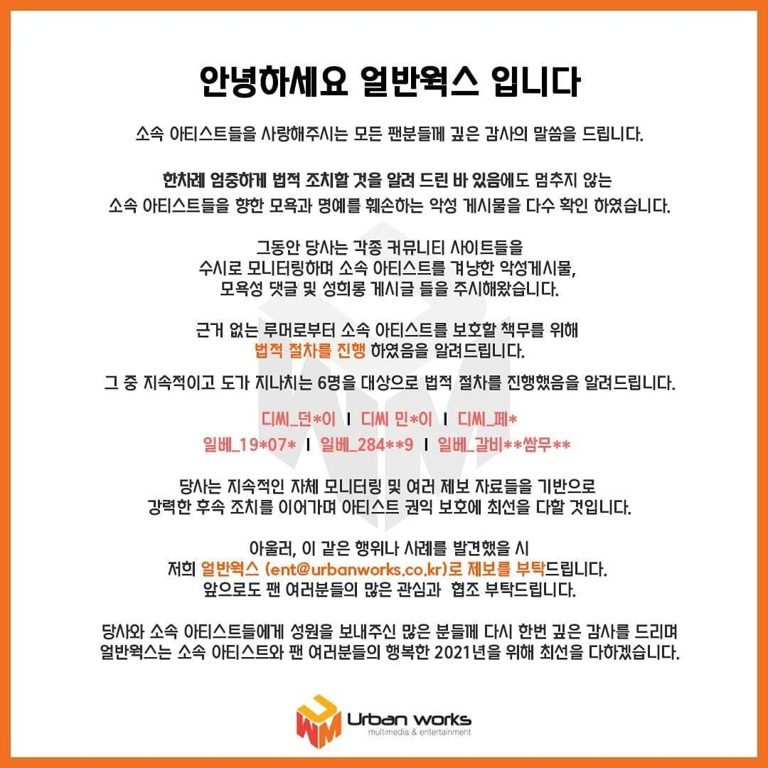 얼반웍스 측은 “소속 아티스트를 겨냥한 악성게시물, 모욕성 댓글 및 성희롱 게시글 들을 주시해왔다”고 전했다.