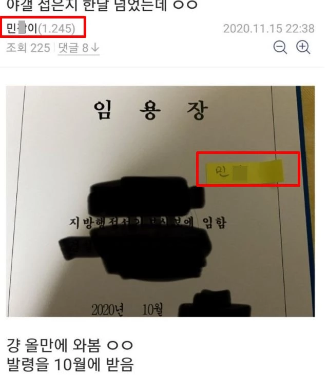 그는 11월 커뮤니티에 9급 공무원 임용장을 올리며 “발령을 10월에 받았다”고 합격을 인증했다.