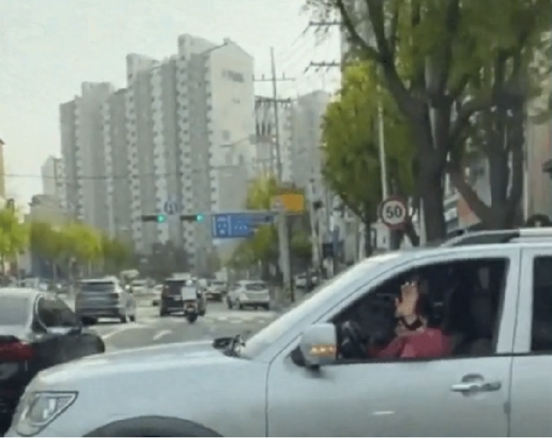 영상 속 할머니 운전자는 골목에서 나와 좌회전을 하려는 듯 멈춰있다. 할머니는 운전석 쪽 창문을 열고 지나가는 차들을 향해 손을 뻗었다.
