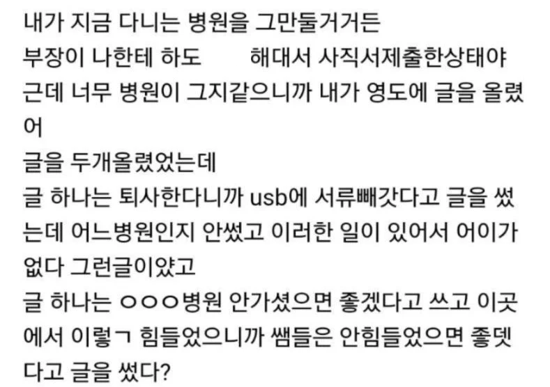 그는 온라인 커뮤니티에 병원 이름은 밝히지 않고 퇴사한 이유와 그동안 병원에서 겪었던 일을 적었다. 그런데 갑자기 상사가 A씨가 올린 글을 프린트해서 보여주며 “글 지워라”고 말했다.
