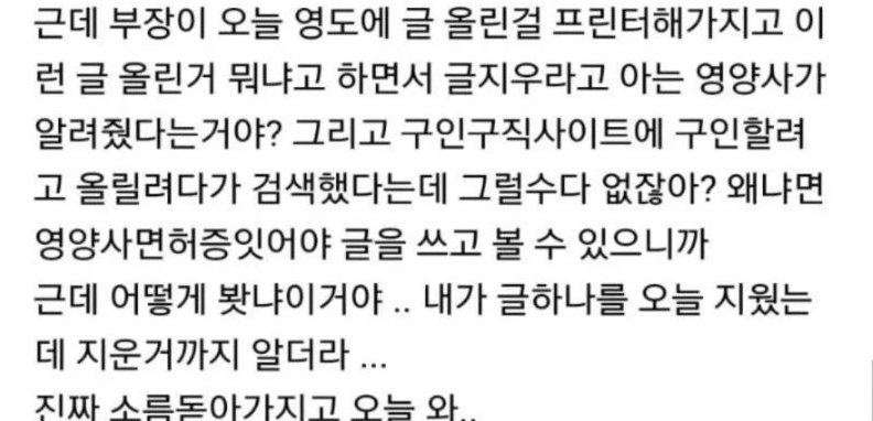 A씨는 “상사가 어떻게 봤는지는 모르겠다. 글 하나를 오늘 지웠는데 그것까지 알더라. 소름 돋았다”고 토로했다.