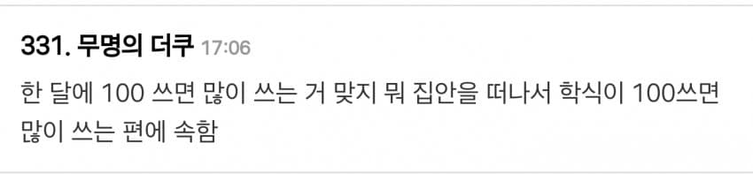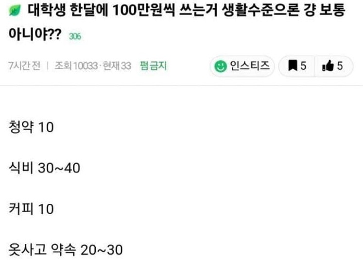 해당 게시글을 올린 작성자 A씨는 “대학생이 한달에 100만원씩 쓰는 거 걍 보통 아니야?”라는 제목의 글로 많은 이들의 관심을 끌었다.