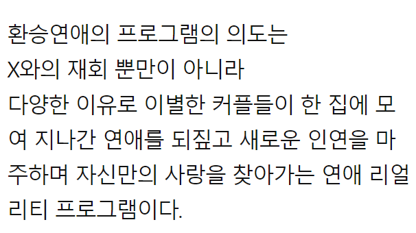다양한 이유로 이별한 커플들이 한 집에 모여 지나간 연애를 되짚고 새로운 인연을 마주하며 자신만의 사랑을 찾아가는 연애 리얼리티 프로그램 환승연애.