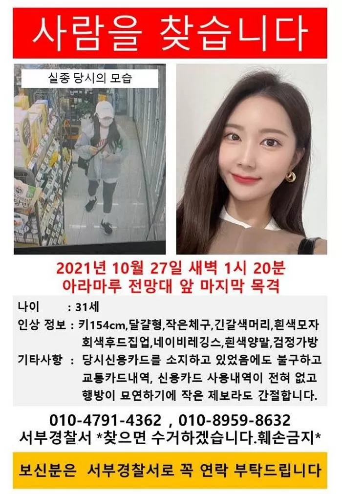 A씨의 가족은 그의 인상착의와 사진 등이 담긴 전단을 제작해 인터넷에 공유를 했었으며, 해당 전단지에는 실종 당시 편의점에서 흰색 모자를 쓰고 소주 한 병 등을 구입하는 A씨의 모습이 담겨 있었다.