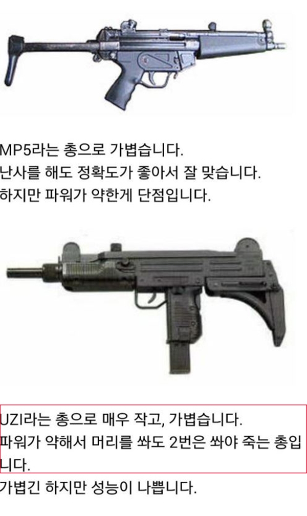 또 불펍방식의 총을 불법이라며 UN에서 허락하지 않은 불법 총이라고 소개했다.