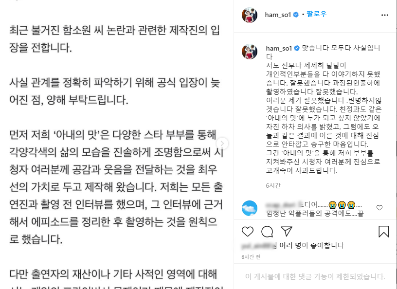 실시간 올라왔던 함소원 아내의맛 조작 인정 글이다.