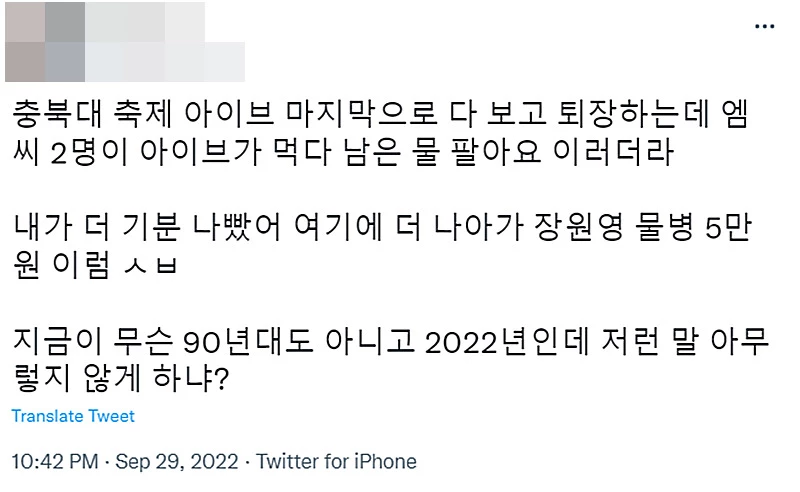 트위터 누리꾼은 “충북대 축제 ‘아이브’ 마지막으로 다 보고 퇴장하는데 엠씨 2명이 ‘아이브가 먹다 남은 물 팔아요’ 이러더라. 내가 더 기분 나빴다. 여기에 더 나아가 ‘장원영 물병 5만 원’이랬다”라고 자신의 생각을 적었다.