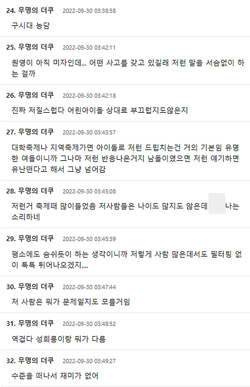 이를 접한 누리꾼들은 “미자한테 도대체 무슨 멘트를 하는 거냐”, “수준 봐라”, “도대체 무슨 생각 하면서 살면 저렇게 빻은 드립을 치냐”, “시대를 읽어라”, “원영이 아직 미자인데 어떤 사고를 하고 있길래 저런 말을 서슴없이 하는 걸까”, “대학 축제나 지역축제 가면 아이돌로 저런 드립 치는 건 거의 기본이다”, “역겹다.