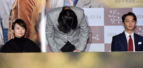 김윤석이 “한 인터뷰 도중, 저의 경솔함과 미련함 때문에 상당한 불편을 초래했다”라 말하며 고개를 숙였다.