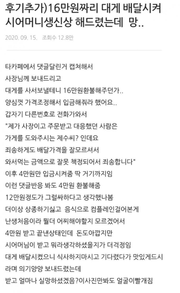 이어 “갑자기 다른 번호로 전화와서 ‘제가 사장이고 주문받았던 사람은 제수씨’라고 하더라. 배달 가격을 잘 몰라 금액이 잘못 측정됐다고 했다”고 적었다.