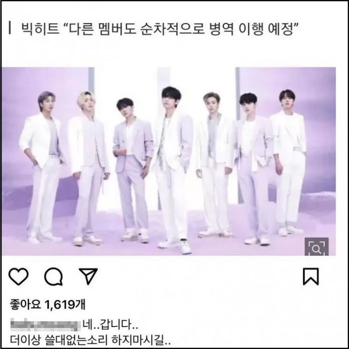 그룹 방탄소년단 소속사가 군입대와 관련한 공식 입장문을 발표했고, 이에 방탄소년단 매니저가 인스타그램에 올린 글이 화제이다.