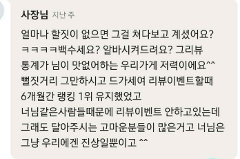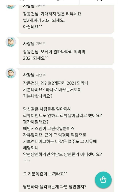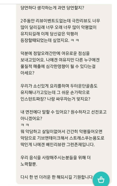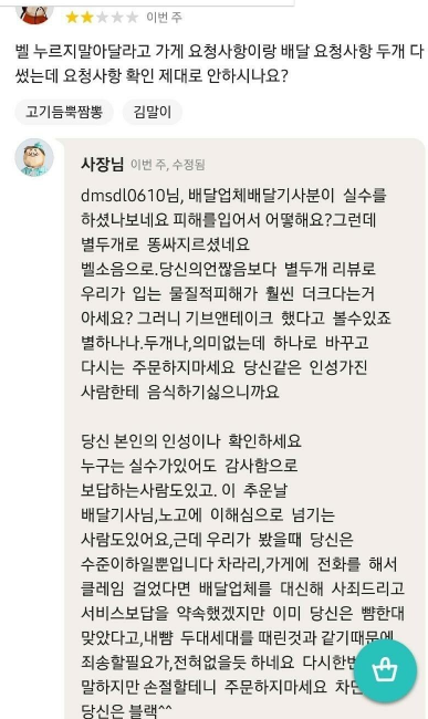 그러자 사장은 “배달 업체 기사분이 실수를 하셨나보다. 피해 입어서 어떡하냐”면서도 “별 두 개로 똥 싸지르셨다. 당신의 얹짢음보다 별 두 개 리뷰로 우리가 입는 물질적 피해가 훨씬 더 크다는 거 아시냐”고 반박했다.