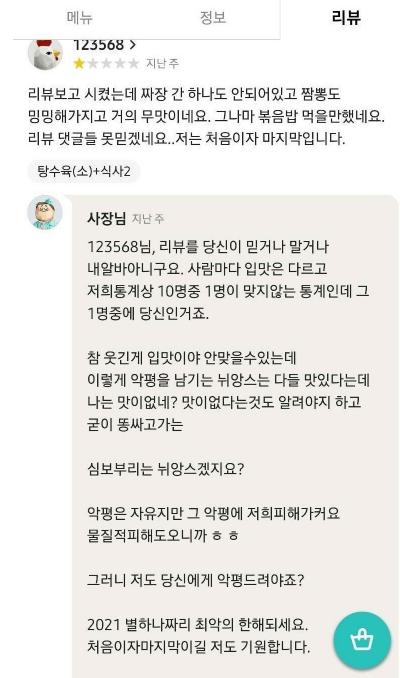 이 사장은 음식에 대해 혹평을 남긴 다른 손님의 리뷰에 대해서도 “사람마다 입맛은 다르고 저희 통계상 10명 중 1명이 맞지 않는 통계인데 그 1명이 당신인 거다”라면서 “2021 별 하나짜리 최악의 한 해 되시라”고 해 놀라움을 자아냈다.