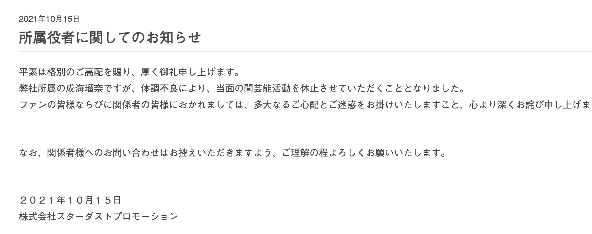 현재 해당 폭로에 대해 나루미 루나 측은 구체적인 사실 확인은 하지 않았으나 나루미 루나의 소속사인 스타더스트에서는 지난 15일 건강상의 이유로 나루미 루가가 당분간 활동을 중지한다는 공지를 올렸다.