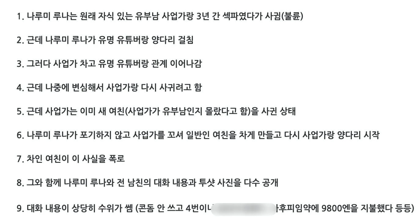 해당 계정에 따르면 나루미 루나는 유명 사업가와 게임 유튜버 사이에서 양다리를 걸쳤다고 주장했다.