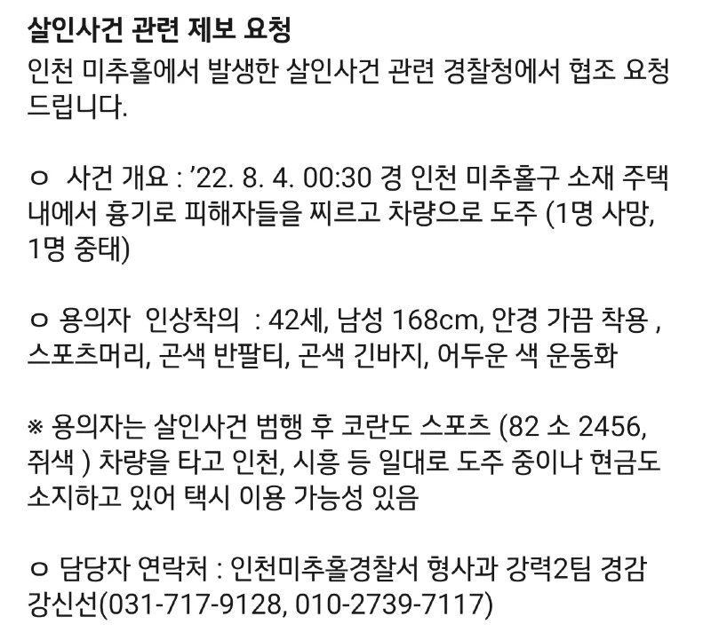 지난 4일 인천미추홀경찰처는 카카오 T 택시 기사들이 이용하는 어플 ‘카카오 T 택시 기사용’에 이날 발생한 살인사건의 용의자에 대한 제보를 요청하는 글을 게시했다.