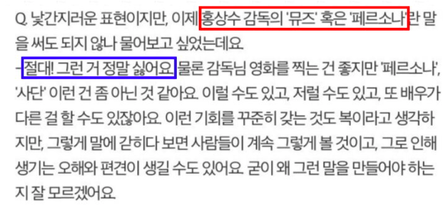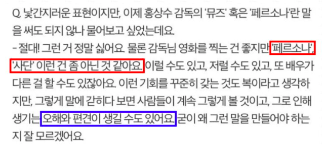 게다가 “페르소나, 사단 이런 건 좀 아닌 것 같아요”, “오해와 편견이 생길 수 있을 것 같다”며 홍상수와의 불편한 관계성을 선을 긋는 모습이었다.