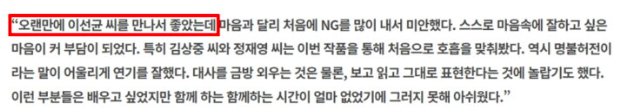 그와 다르게 동료 배우 이선균에 대해서는 “오랜만에 이선균 씨를 만나서 좋았다”고 표현해 화제가 되기도 했다.