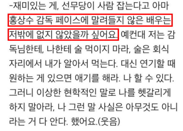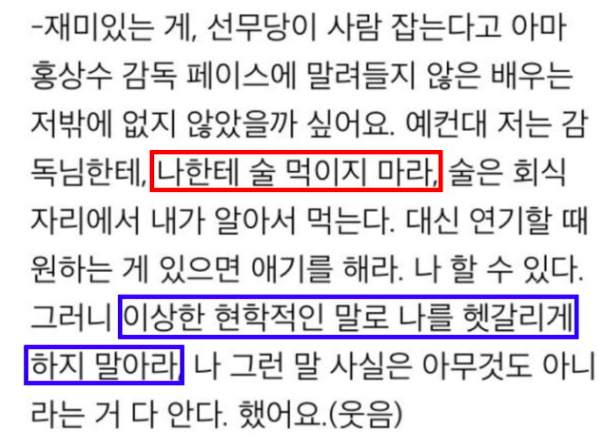 이에 고현정은 홍상수에게 “나한테 술 먹이지 마라”, “이상한 현학적인 말로 나를 헷갈리게 하지 말아라”라 뱉었다.