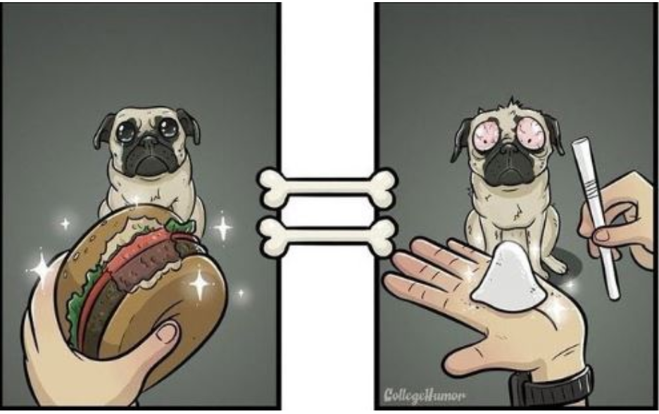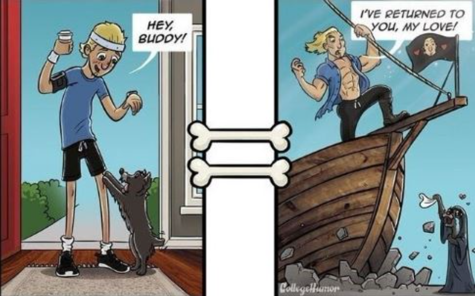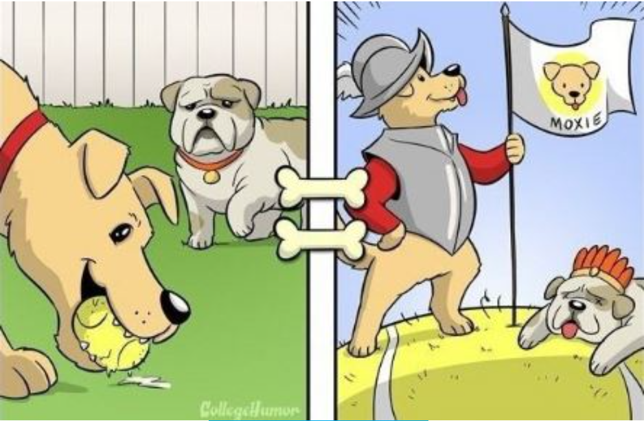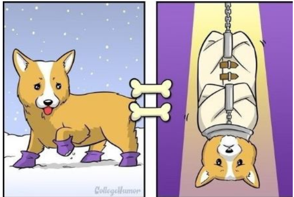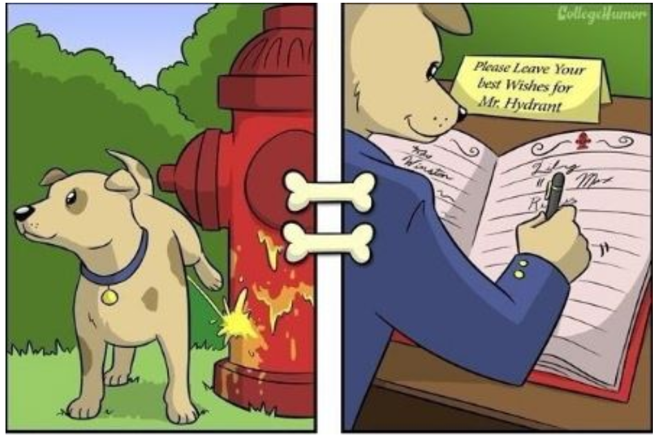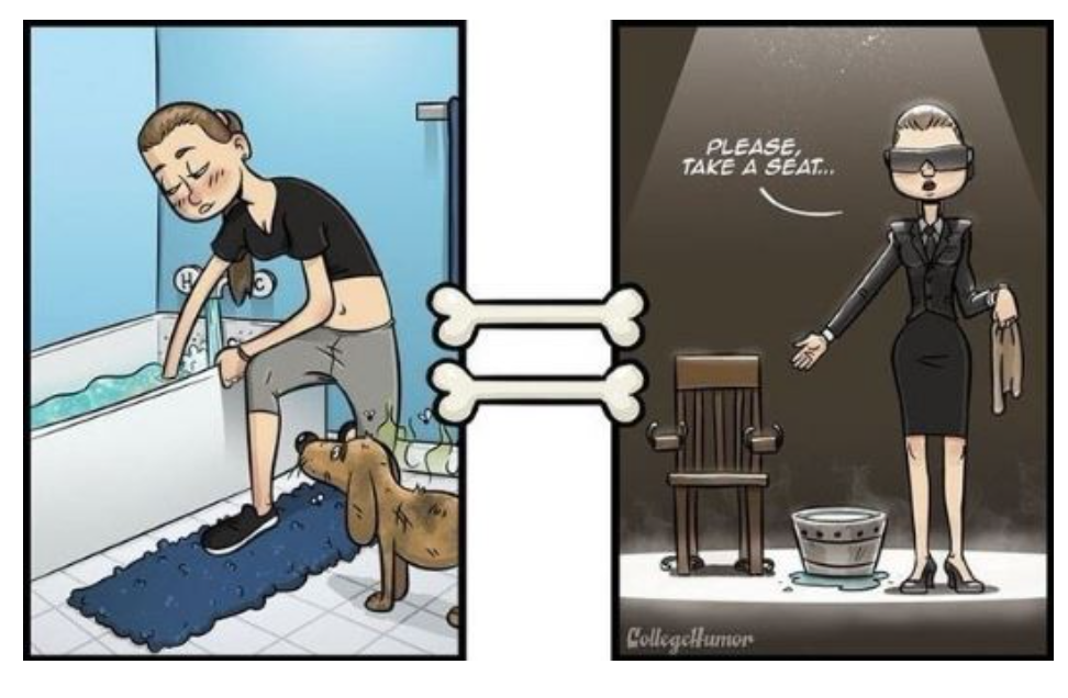 강아지들이 평소에 하는 행동이나 어떤 것을 떠올릴때 어떤 생각을 하는지에 대한 일러스트다.