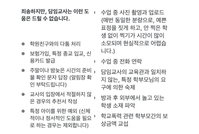 담임교사가 할 수 없는 것에 나온 글들을 접한 누리꾼들은 “얼마나 이상한 부모들이 많으면 이런 걸 써서 보내냐” 라는 대다수의 반응을 보였다.