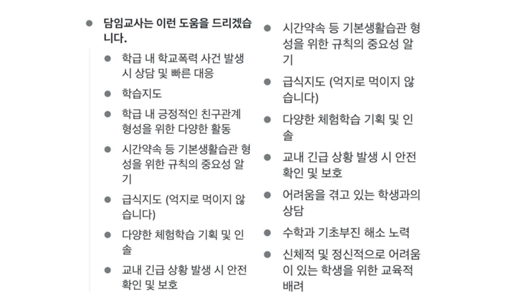 또 “담임교사는 이런 도움을 드리겠습니다.”라는 담임교사가 할 수 있는 것에 대해 나열했다.
