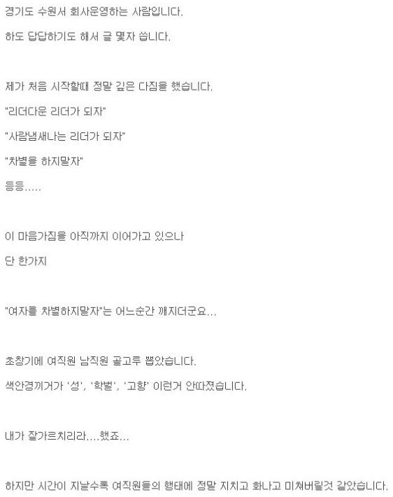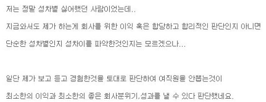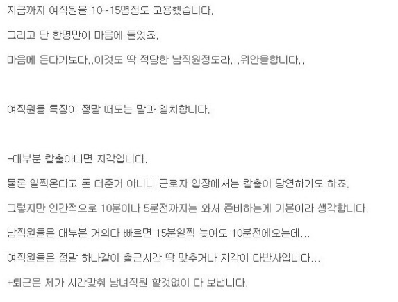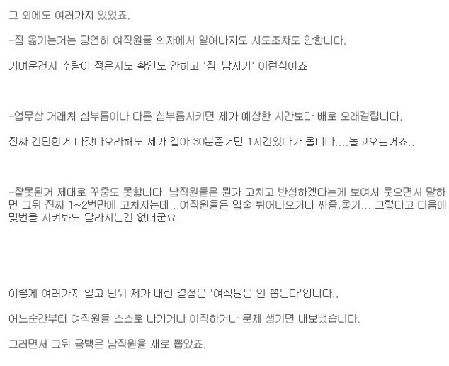 회사 초창기에 성,학벌,고향 이런 것 따지지 않고 여직원, 남직원 골고루 뽑았지만, 시간이 지날 수록 여직원들의 행태에 정말 지치고 화가 났다고 한다.