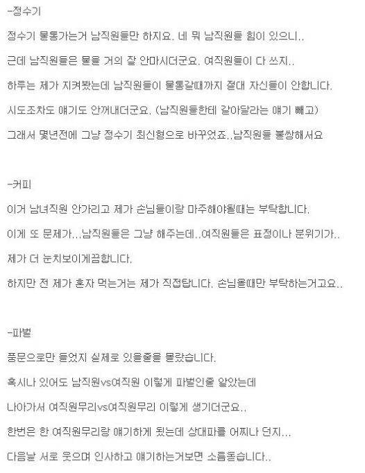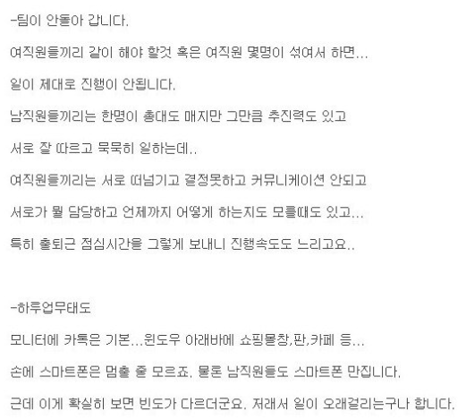 대부분 칼출아니면 지각, 아랫사람 잘 부려먹는 행동, 여직원들끼리 일을 하면 일이 제대로 진행이 안된다, 파벌 행동 등 다양한 문제점들이 있다고 한다.