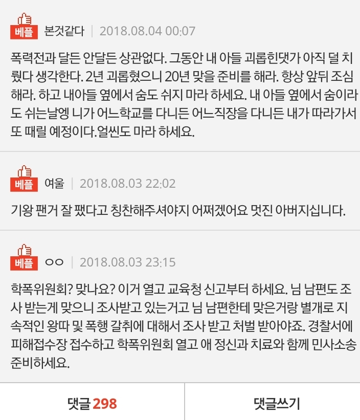 누리꾼들은 “좋은 말로 해서 해결이 안 되면 숨 넘어가기 직전까지 패야지 별 수 있나”, “아버님 나이스샷”, “생존의 문제인데 잘하셨음”, “안 그랬으면 아들이 맞고 들어왔겠지” 등의 반응을 보였다.
