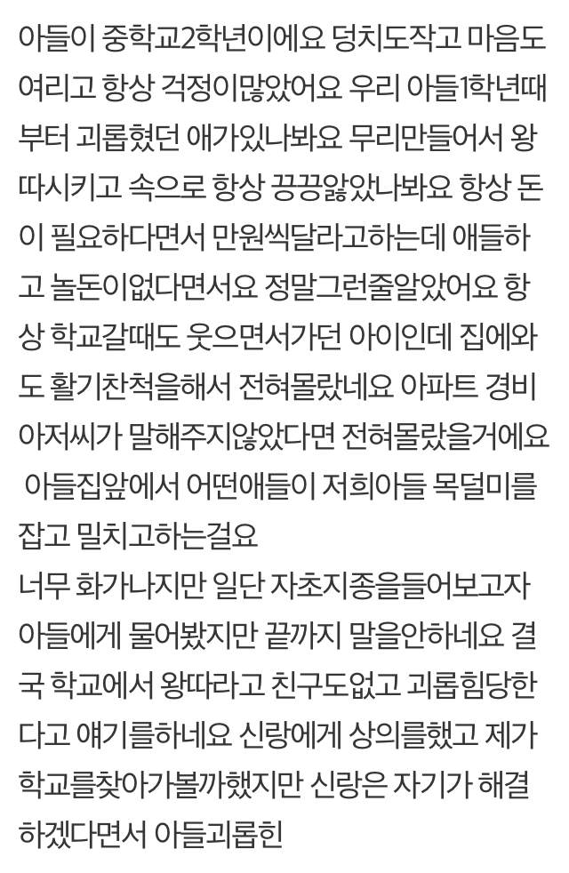 그러던 어느날 A씨는 경비 아저씨의 제보로 아들이 폭력을 당한다는 사실을 알아챘다.