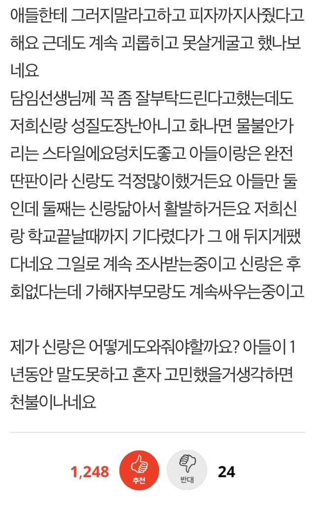 A씨는 “신랑에게 상의를 했고, 신랑은 자기가 해결하겠다며 아들 괴롭힌 애들한테 그러지 말라고 피자까지 사줬다더라”고 밝혔다.