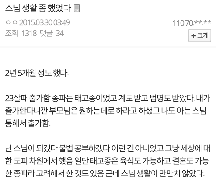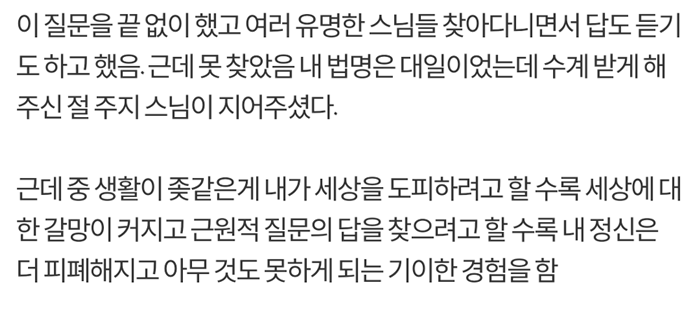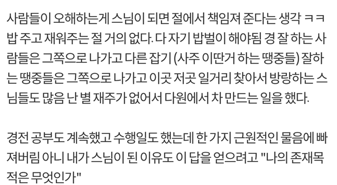 절에 들어간다고 해서 속세랑 다를 게 없다”며 글을 마무리했다.