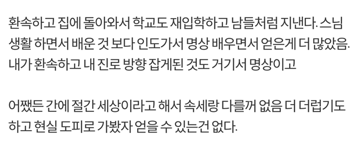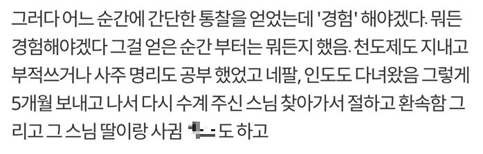 이후 집으로 돌아온 A씨는 “스님 생활하면서 배운 것보다 인도가서 명상 배우면서 얻은 게 저 많았다.