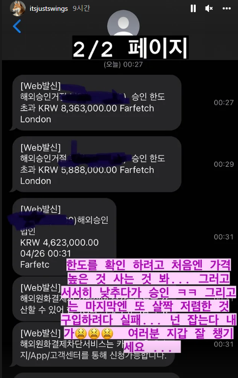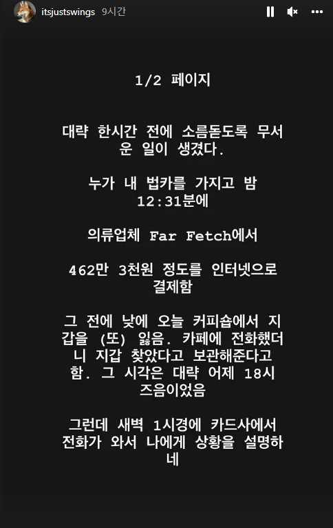 이어 “누가 내 법카를 가지고 밤 12시 31분에 의류업체에서 462만3천 원 정도를 인터넷으로 결제함”이라고 밝혔다.