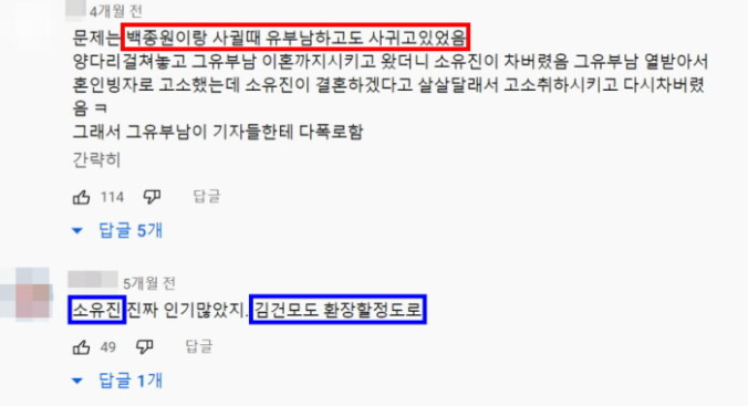 이 글을 본 네티즌들은 ”백종원이랑 사귈 때 유부남하고도 사귀었었음”, ”김건모도 소유진한테 환장했었다’라 다양한 반응을 남겼다.