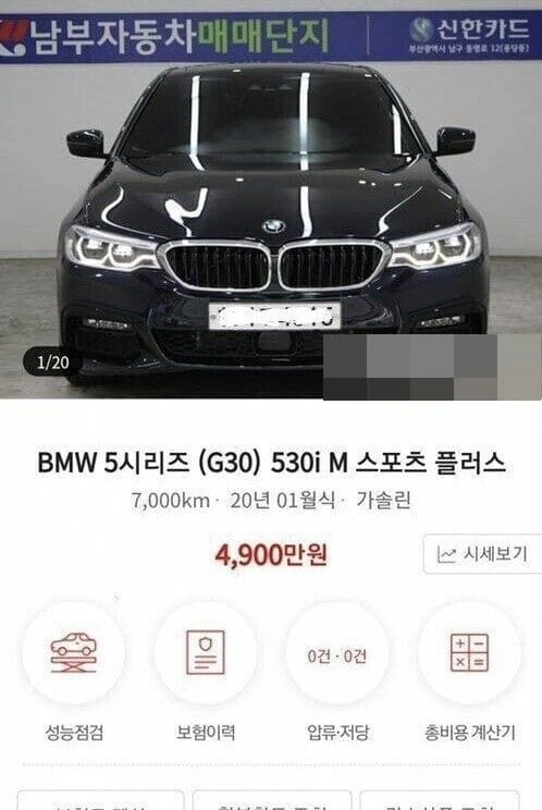 글에는 최근 중고차 판매 사이트에 올라온 2020년 연식 BMW 5시리즈 G30 중고 모델을 판매하겠다는 정보가 적혀있었다.