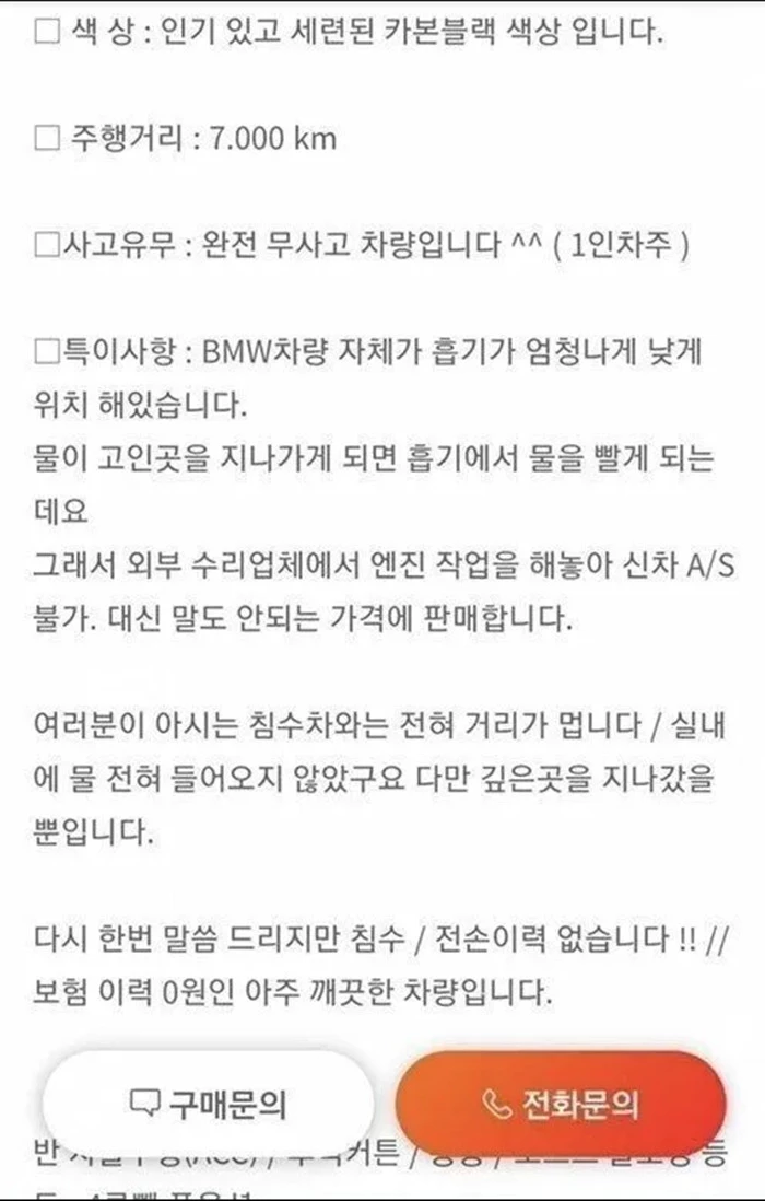 판매자는 “여러분이 아시는 침수차와는 전혀 거리가 멀다. 실내에 물 전혀 들어오지 않았다”면서도 “다만 깊은 곳을 지나갔을 뿐”이라고 기재했다.