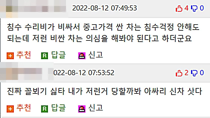 대단한 논리”, “진짜 꼴 보기 싫다. 내가 저런 거 당할까 봐 그냥 신차 샀다”, “침수 수리비가 비싸서 중고 가격 싼 차는 침수 걱정 안 해도 되는데 저런 비싼 차는 의심을 해봐야 한다고 하더라”등 다양한 반응을 보였다.
