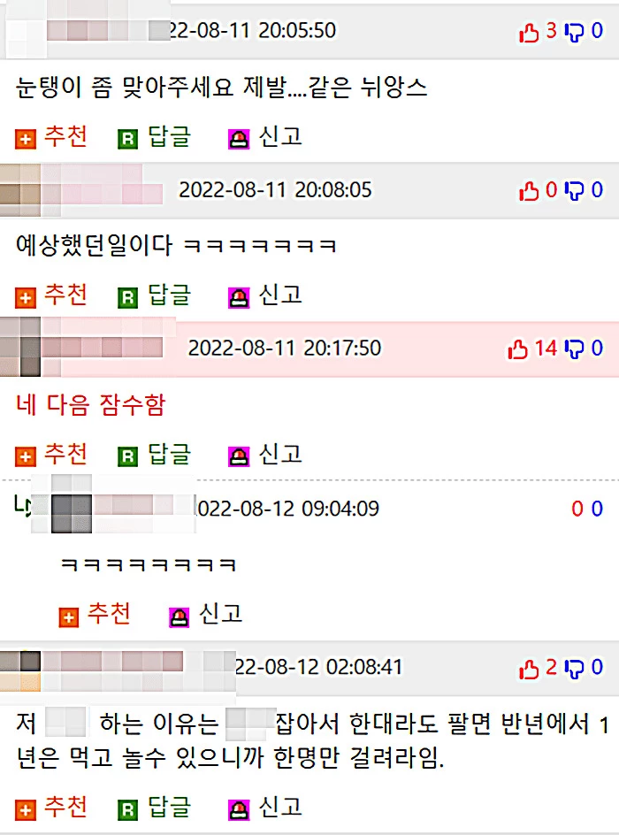 이를 접한 누리꾼들은 “예상했던 일이다”, “지인이 한 반년은 중고차 쪽은 쳐다도 보지 말라더라”, “네 다음 잠수함”, “자기들이 매입할 때는 침수차라서, 미세한 흠집 있어서 감가하고 팔 때 되니까 깊은 웅덩이 지나갔어도 성능에 문제없다는 거냐.