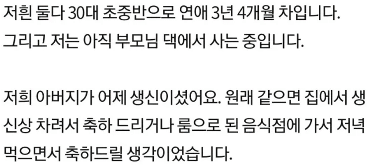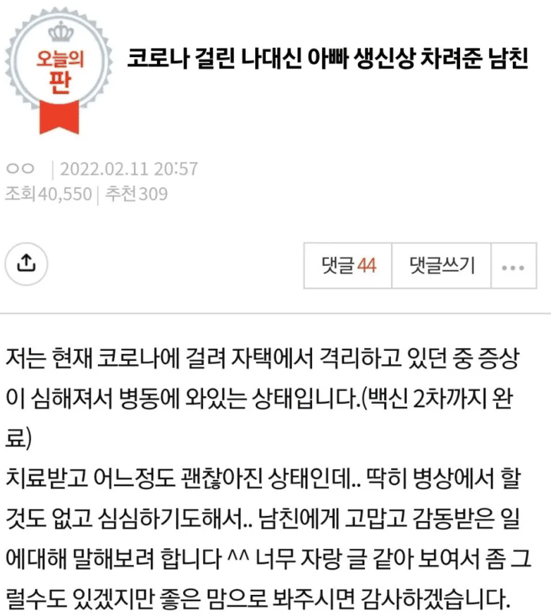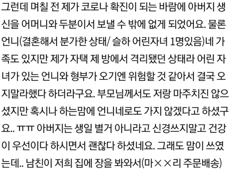 이는 “코로나 걸린 나 대신 아빠 생일상 차려준 남친”이라는 제목의 글로 올라왔다.