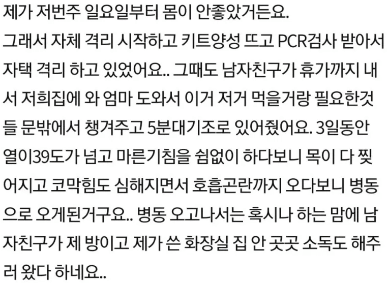 작성자 A씨는 “저는 현재 코로나에 걸려 자택에서 격리하고 있던 중 증상이 심해져서 병동에 와있는 상태입니다” 라고 전하며 서두를 놓았다.