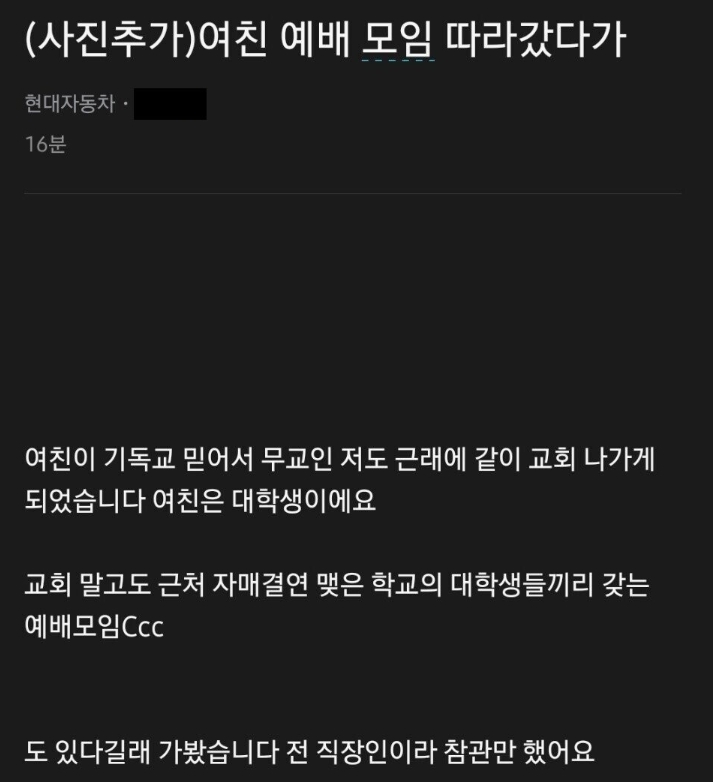 그는 “여친이 기독교 믿어서 무교인 저도 근래에 같이 교회를 나갔다. 교회 말고 근처 자매결연 맺은 학교 대학생들끼리 예배모임을 한다길래 가봤다. 직장인이라 참관만 했다”고 전했다.