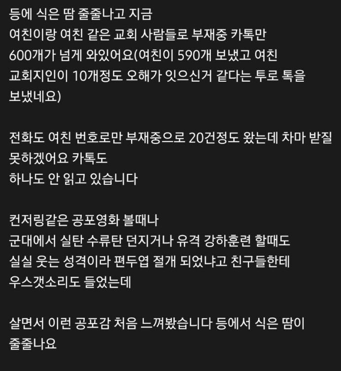A 씨는 “부재중 카톡만 600개가 와있다. 여친이 590개를 보냈고, 교회 지인들이 10개를 보냈다. 오해가 있는 것 같다는 내용이다”라고 말하며 “차마 여자친구 연락을 못 받겠다. 컨저링같은 영화 볼 때나, 군대에서 실탄 수류탄 던질 때도 무섭지 않았는데 살면서 이런 공포감은 처음 느껴봤다”고 자신의 생각을 전했다.