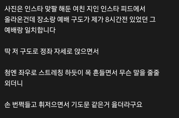 그러면서 A 씨는 자신의 여자친구 SNS에 올라와있는 예배 사진을 올렸다.