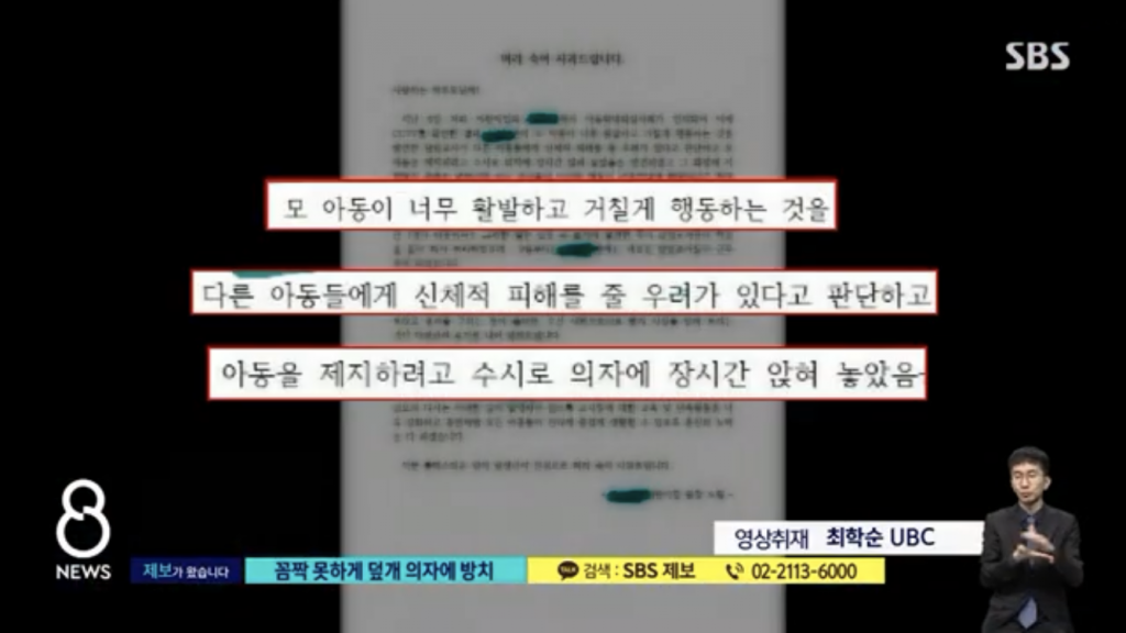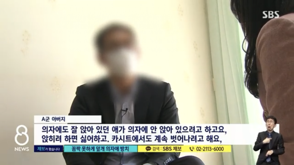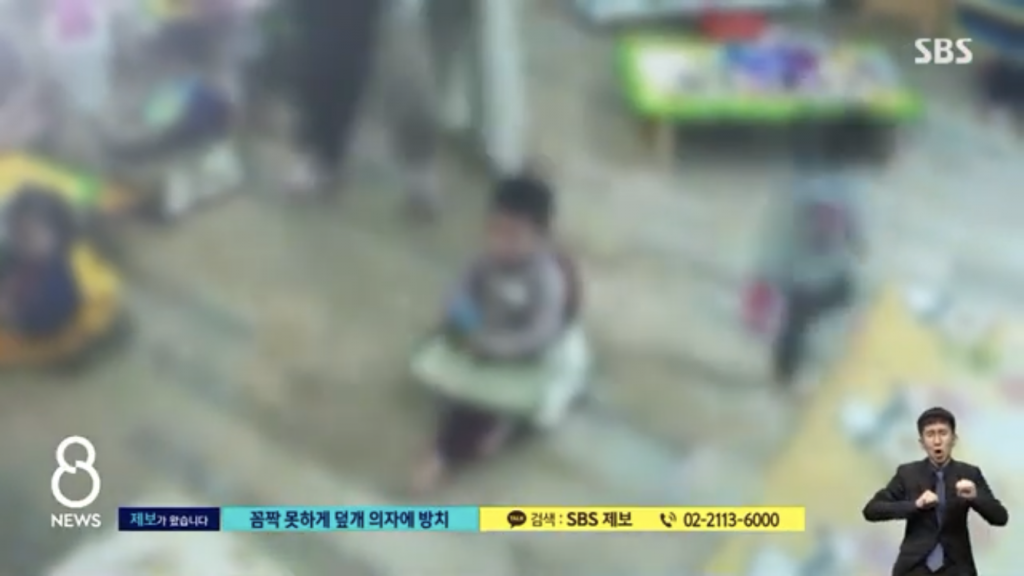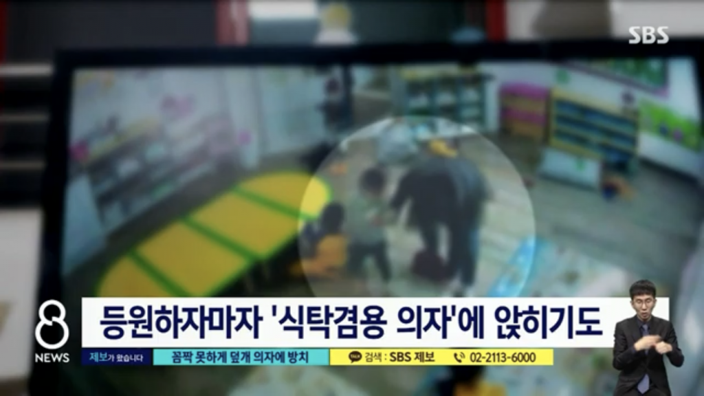 보도에 따르면 해당 어린이집에서는 28개월 A군을 식판 달린 의자에 앉혀놓고 몇 시간씩 움직이지 못하게 했다.