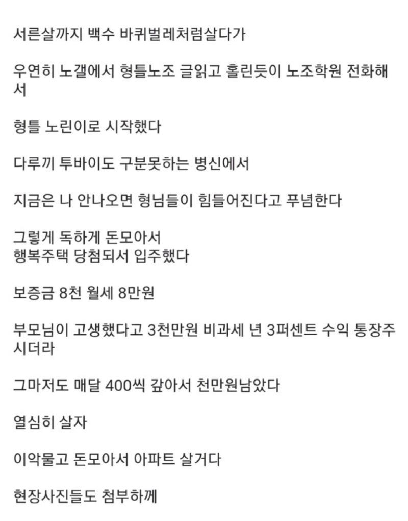 그는 “열심히 살자. 이 악물고 돈 모아서 아파트 살거다”라고 포부를 전했다.