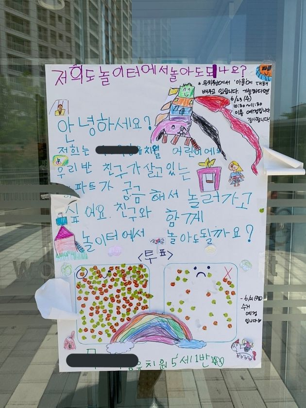 아이들은 “저희는 유치원 어린이다. 우리반 친구가 살고있는 아파트가 궁금해서 놀러가고 싶다. 친구와 함께 놀이터에서 놀아도 될까요?”라고 공손하게 물었다.