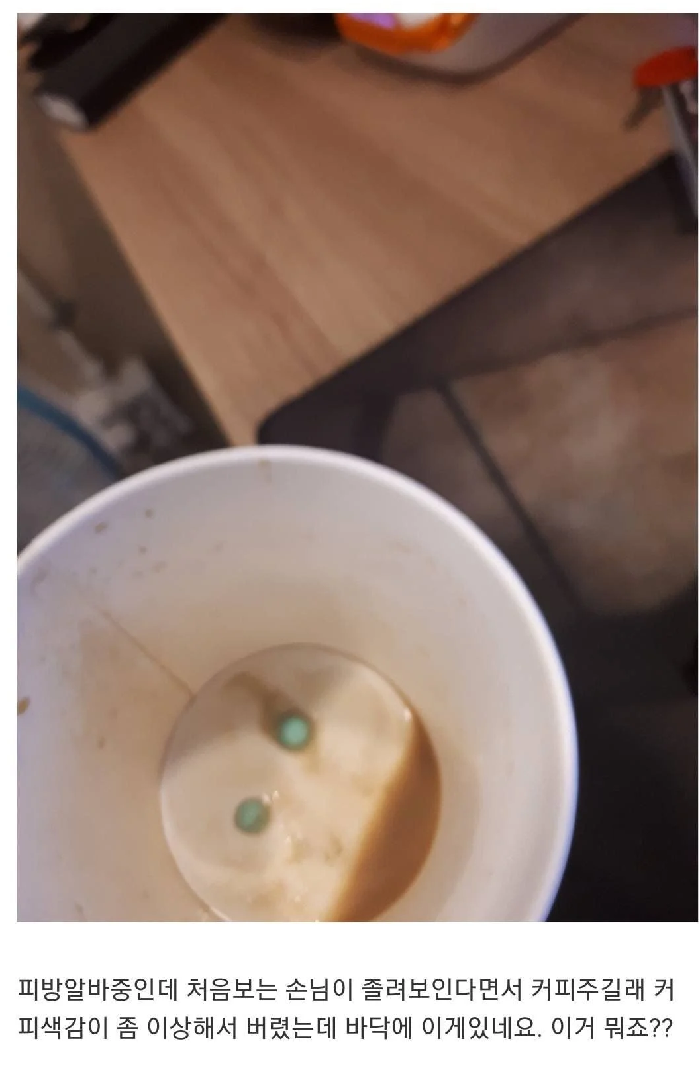 네티즌 A씨는 PC방에서 알바를 하고 있다고 밝혔다. A씨는 “처음보는 손님이 졸려 보인다면서 커피를 줬다. 그런데 커피가 좀 이상해서 버렸는데 바닥에 이런 게 있다”며 사진 한 장을 공개했다. 해당 사진 속 종이컵에는 수상해보이는 파란색 알약 두 알이 들어있다.
