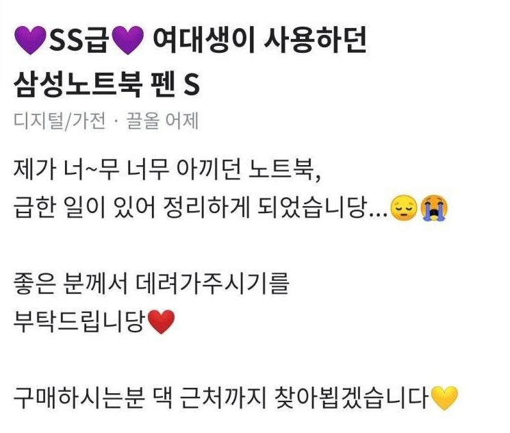 당근마켓 사용자 A씨는 “SS급 여대생이 사용하던 노트북”이라며 “제가 너무 너무 아끼던 노트북 급힌 일이 있어 정리하게 되었습니다”고 설명했다.