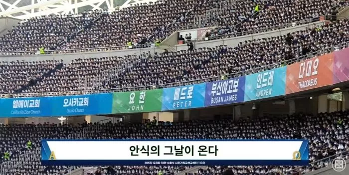 신천지 수료생들의 숫자는 말 그대로 어마어마한 규모로, 수료 복장을 맞춰 입은 교인들은 관중석과 그라운드까지 빽빽하게 채워져있었다.
